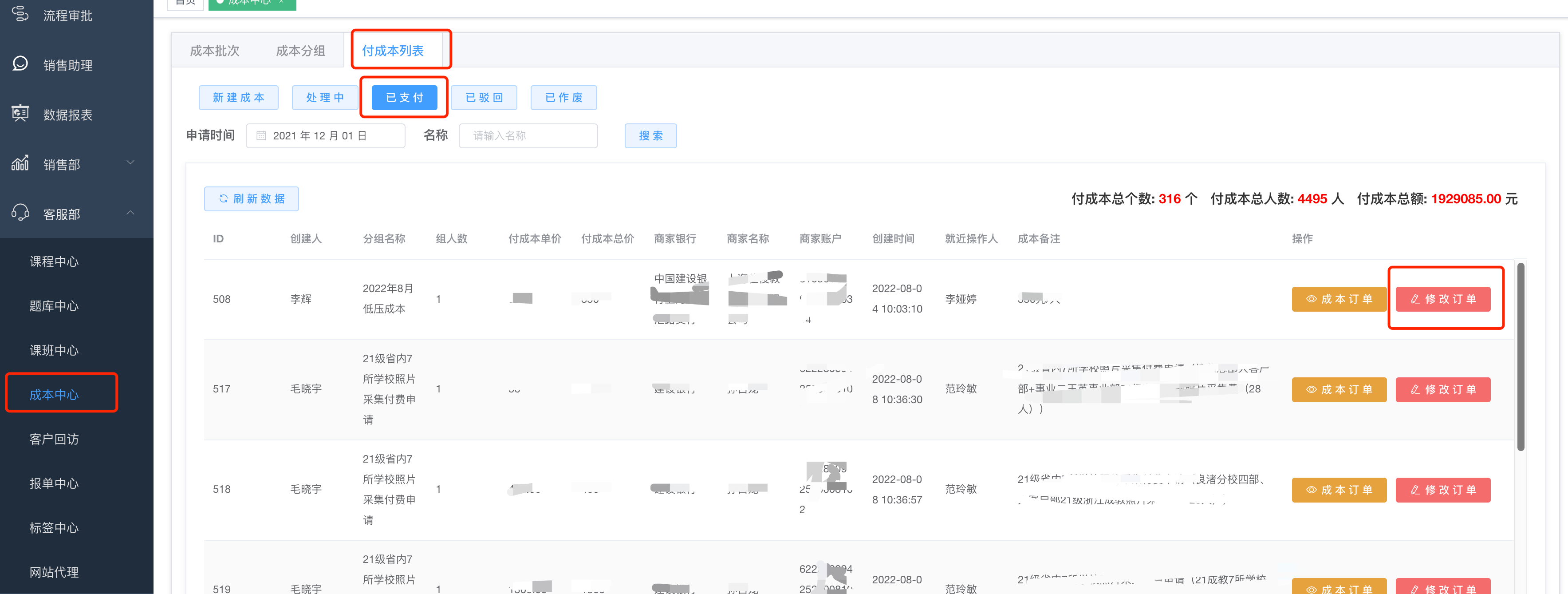 第一步:在成本中心-->付成本列表-->点击已支付