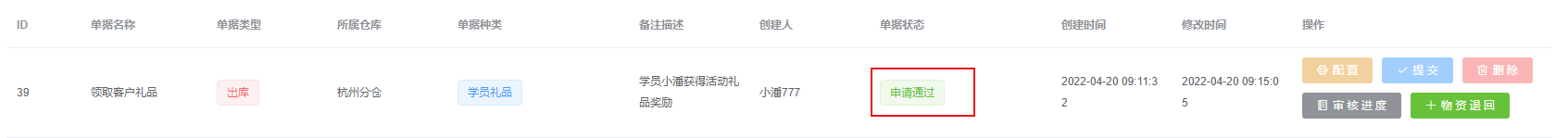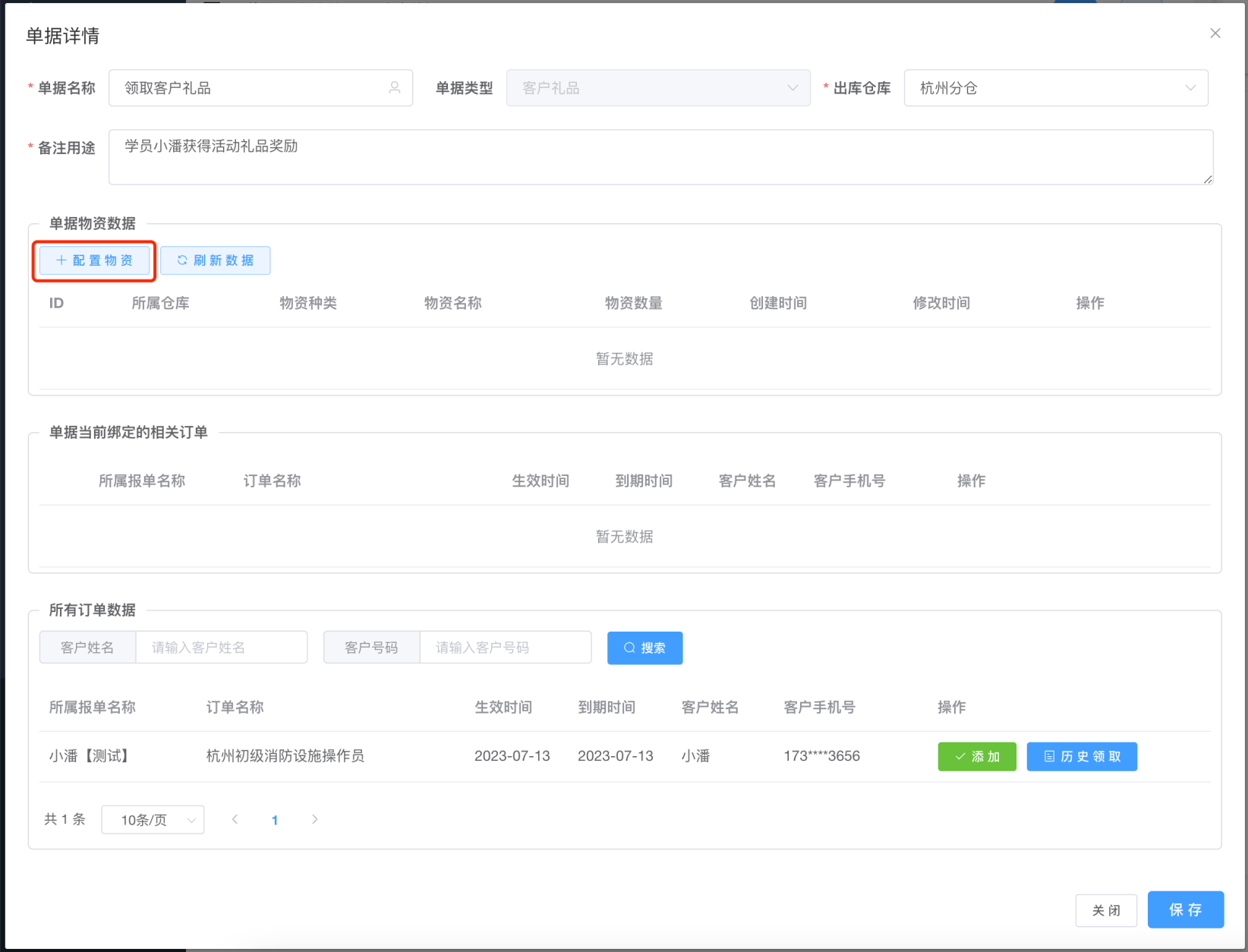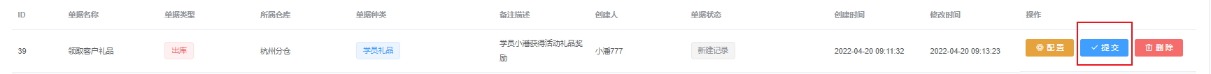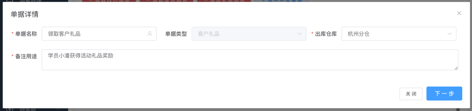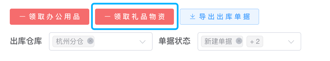 第一步:点击菜单栏出库单据-->点击领取礼品物资按钮