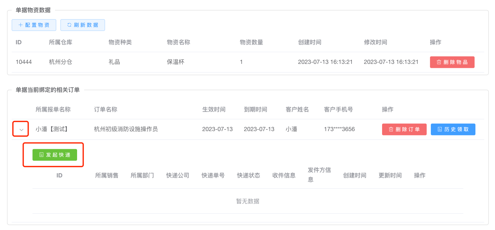 第六步:点击客户角标,点击发起快递按钮,创建快递单