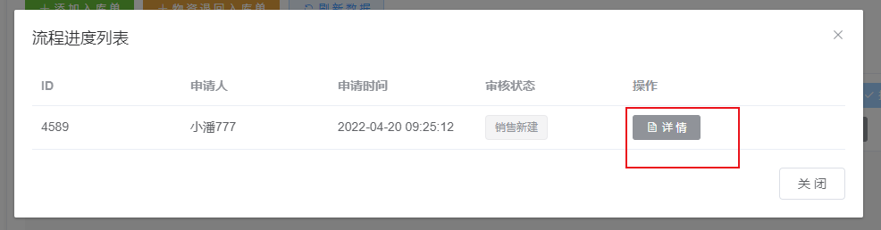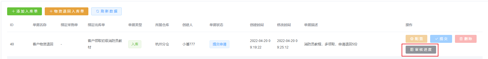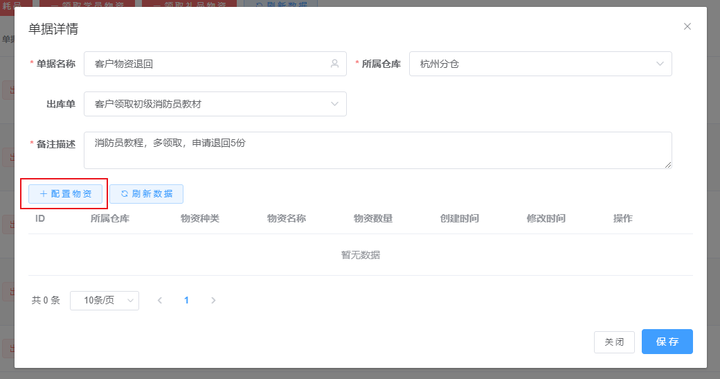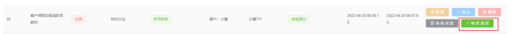 第一步:点击菜单栏出库单据-->找到需要退回物资的出库单-->点击物资退回按钮