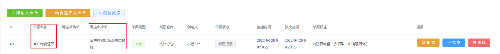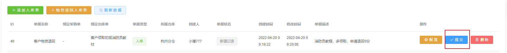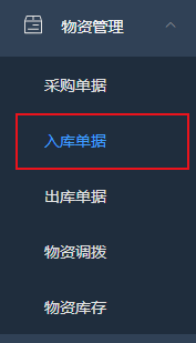 第四步:点击菜单栏入库单据,找到创建的物资退回的入库单