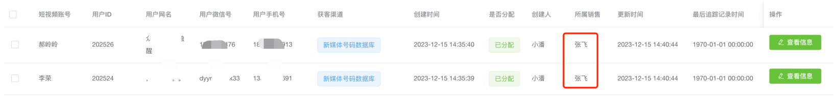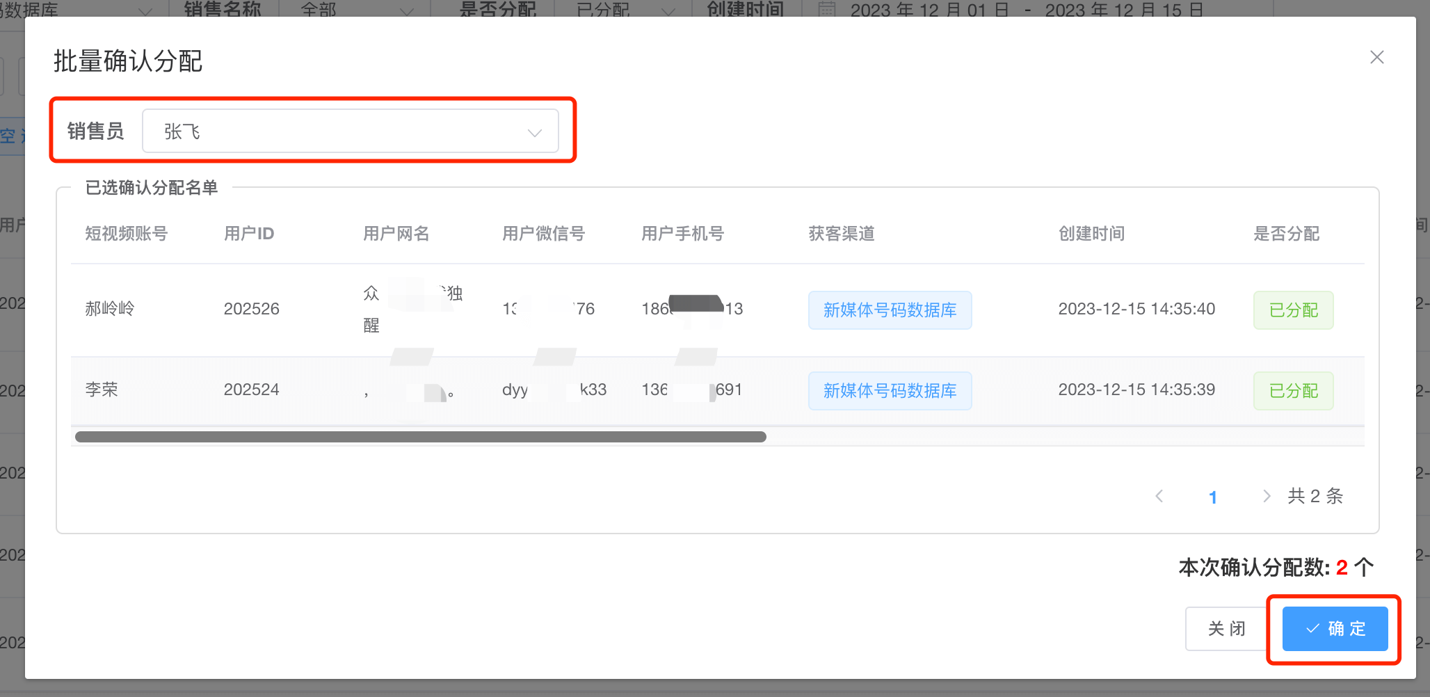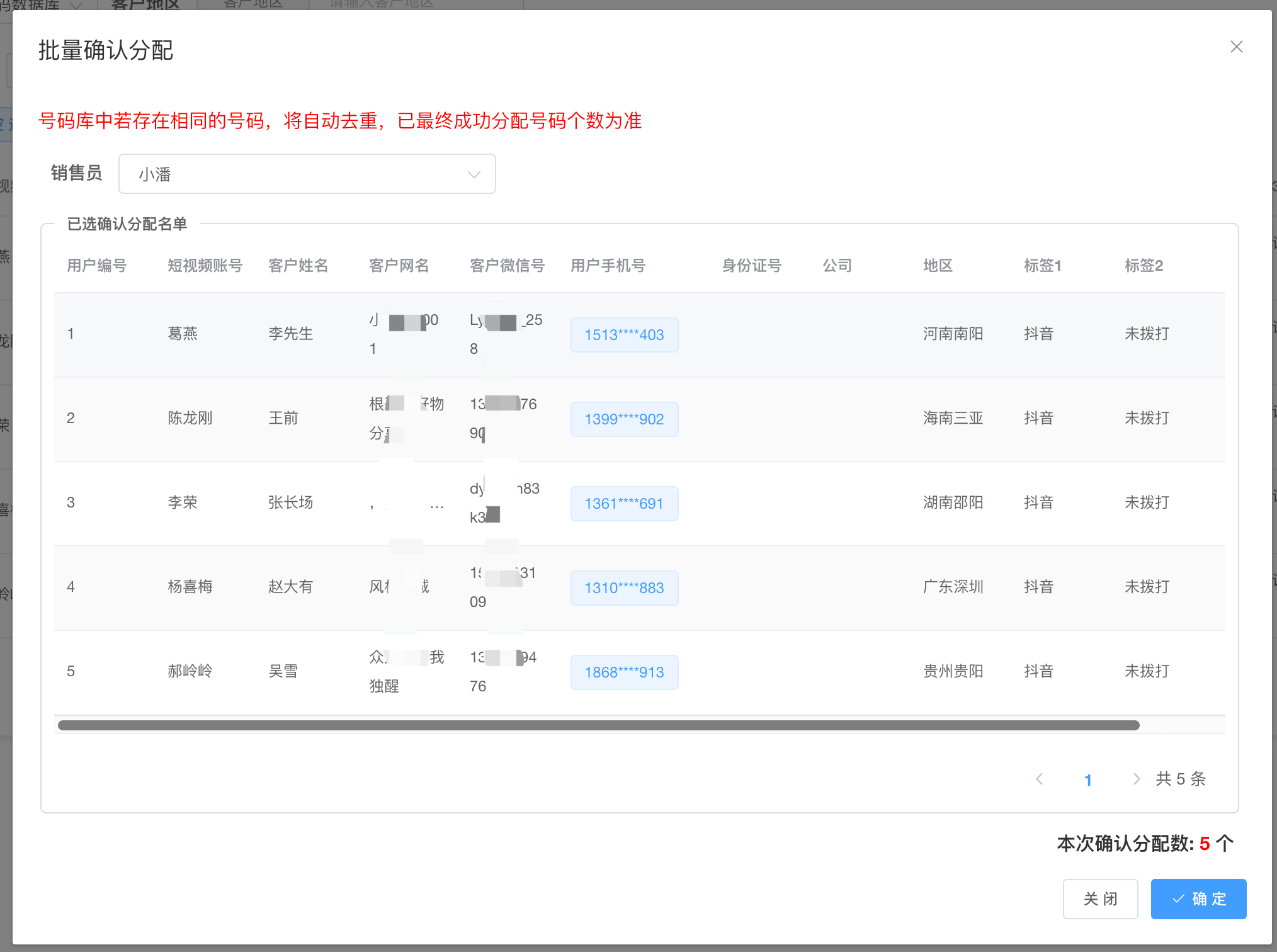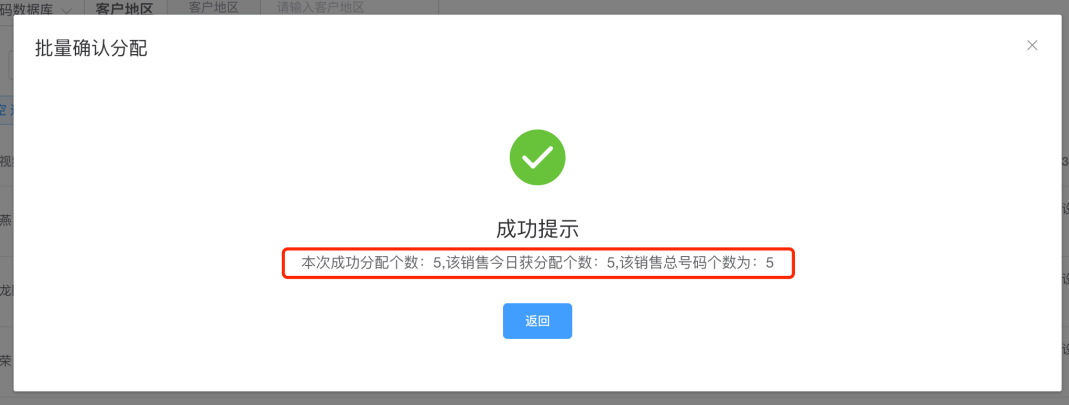 第五步:选择要接收号码的销售,点击确定按钮,即可分配成功【注意:如果分配的号码已经存在与新媒体库中,系统将自动去重】