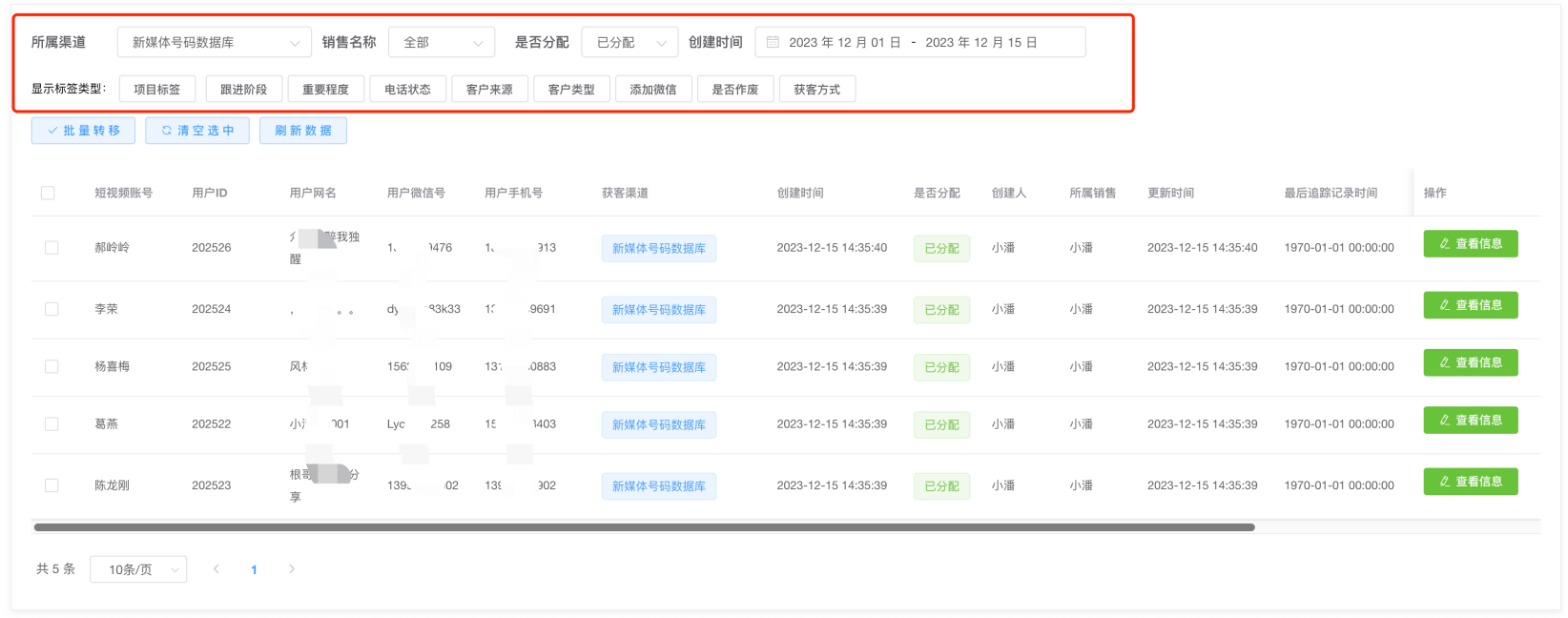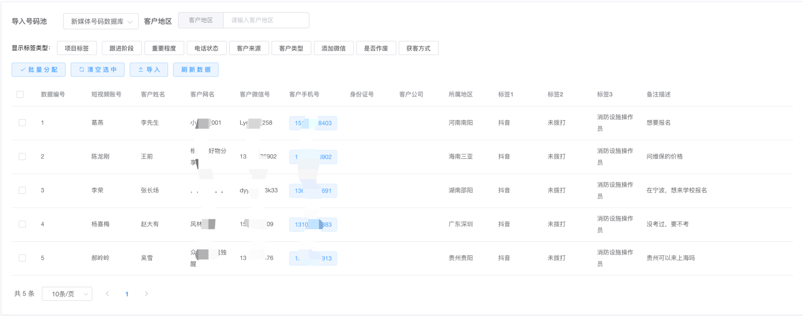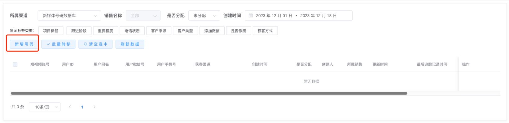 第一步:若需要转移某销售手上的号码,在新媒体-->号码管理,根据筛选项,可以进行数据筛查