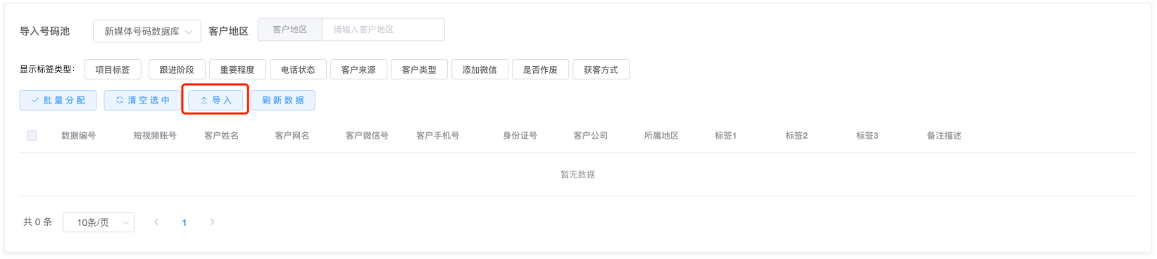 第一步:获取角色后,重新登录系统,在新媒体-->导入号码-->点击导入按钮