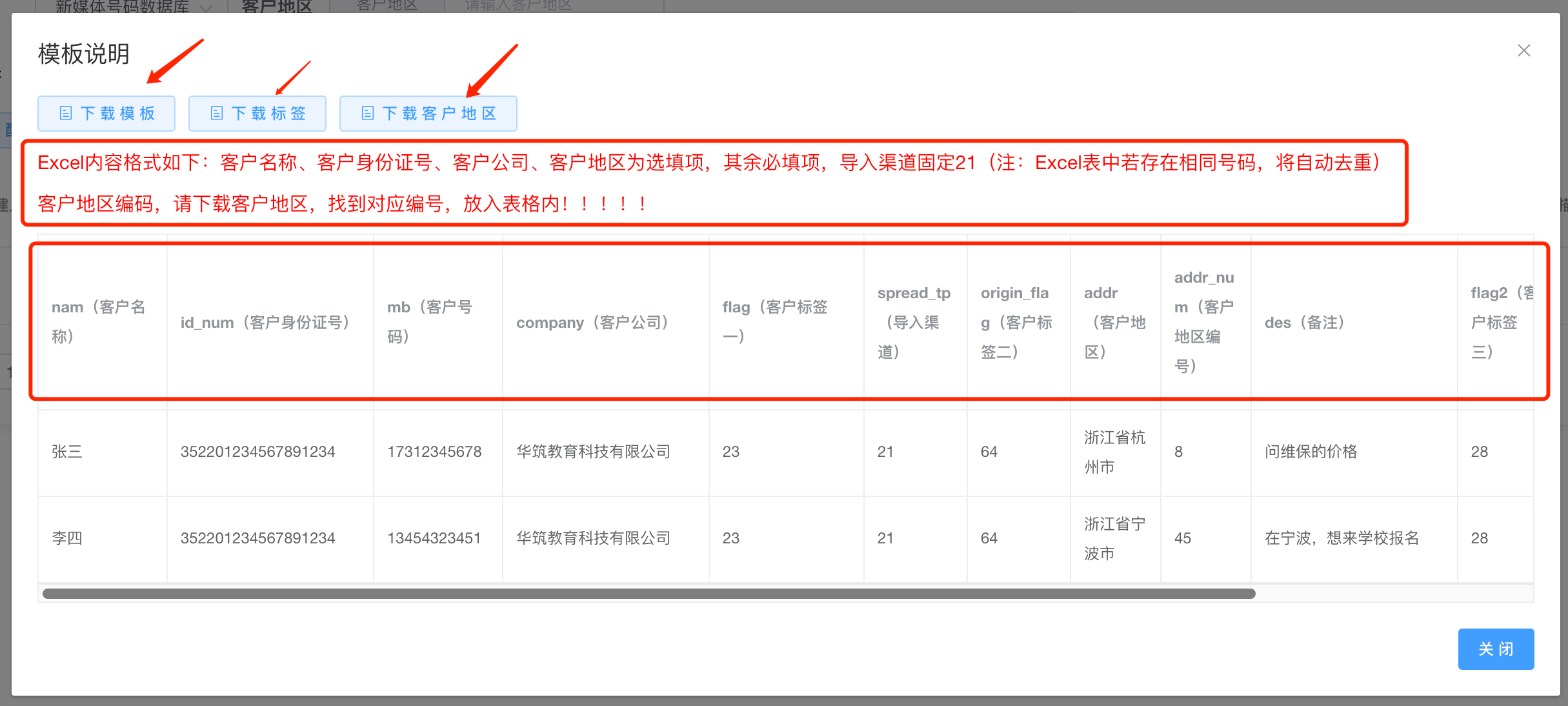 注意点:模板中的表头顺序不能改变,根据上图字段说明,将对应信息,放入对应列下,其中:“flag、origin_flag、flag2、addr_num”均需要从下载的数据表中,选择想要的对应ID填入,最终将要导入数据的Excel表格正确示范: