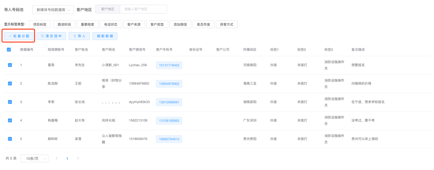 第四步:勾选号码,点击批量分配按钮