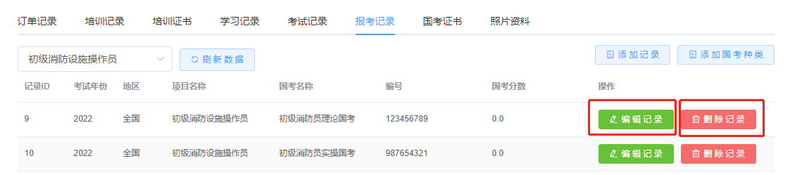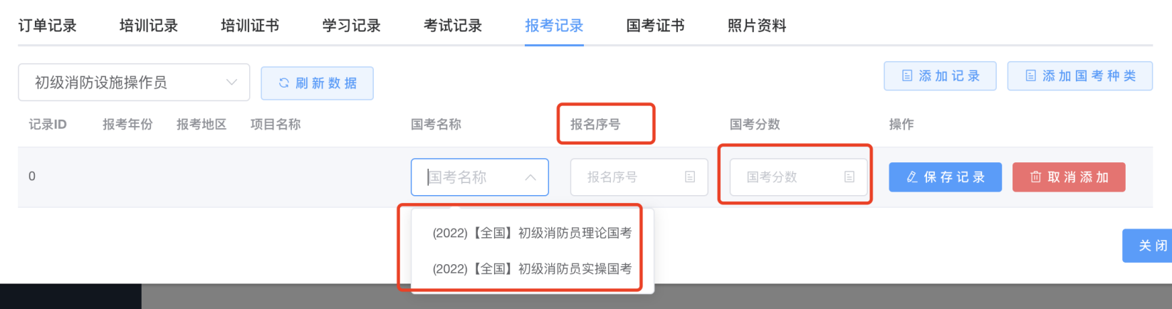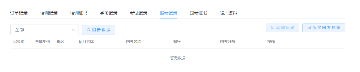 - 报考记录:显示的是客户预约国考的记录信息,需要手动添加
