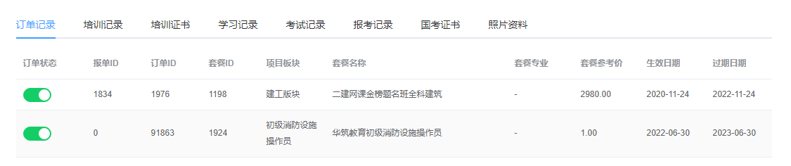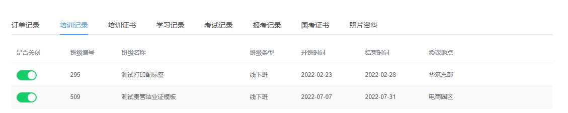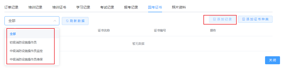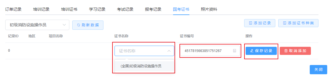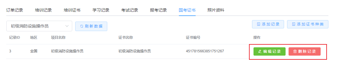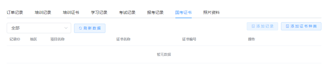 - 国考证书:显示的是学员,通过国考后的证书编号的记录