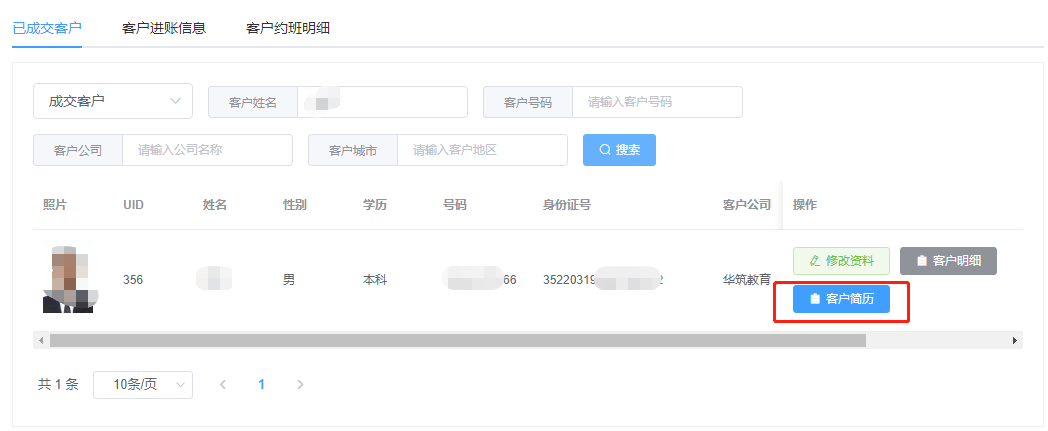 第二步、搜索完成后,点击客户简历按钮,打开简历弹框
