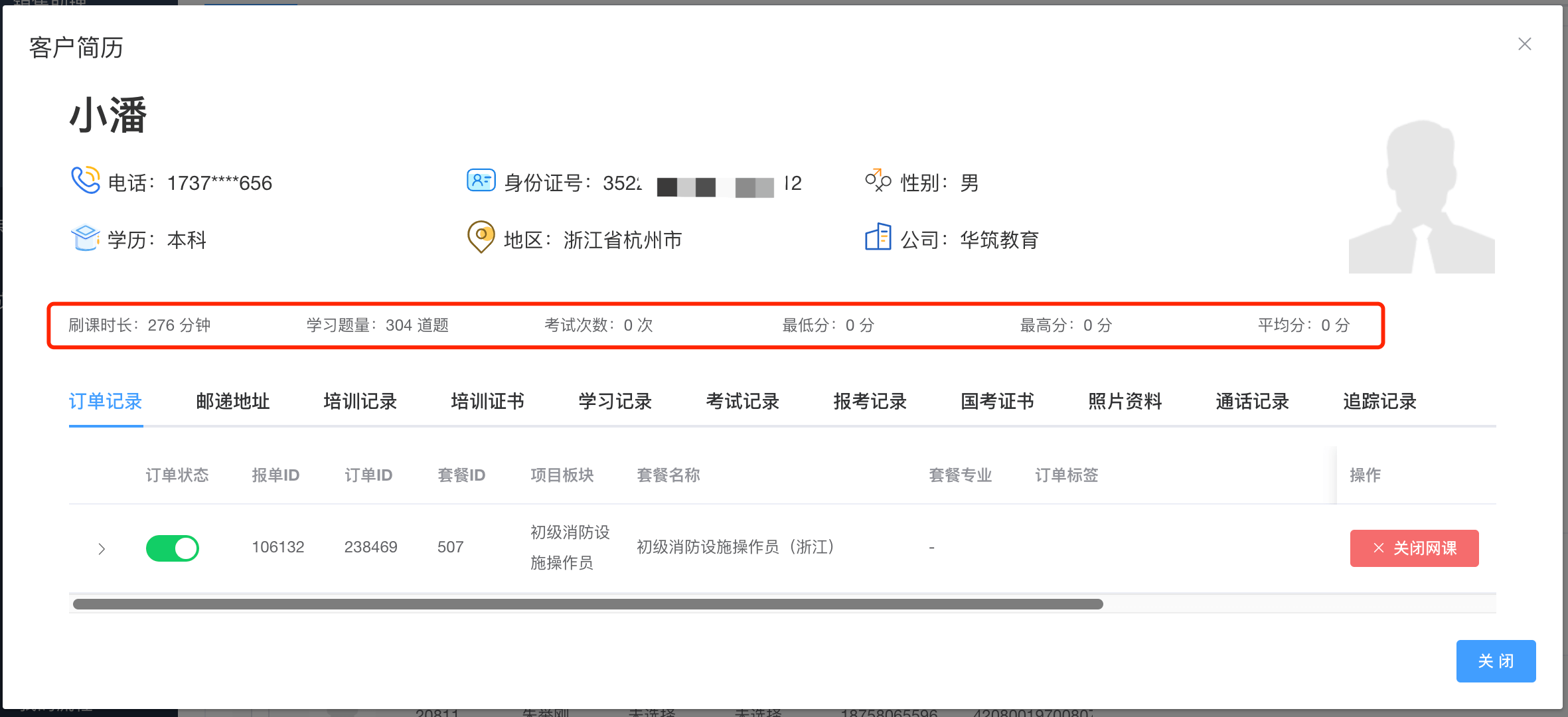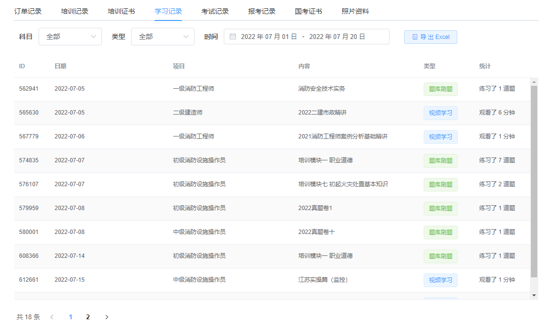 - 学习记录:显示的是客户的刷题、刷课的记录