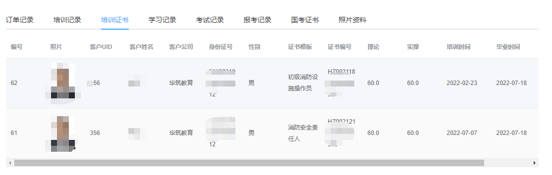 - 培训证书:显示的是客户已经培训成绩合格后,生成的打印结业证信息