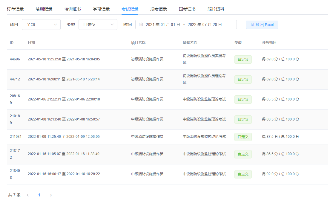 - 考试记录:显示的是学员真题考试、模拟考试、自定义考试的记录