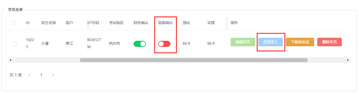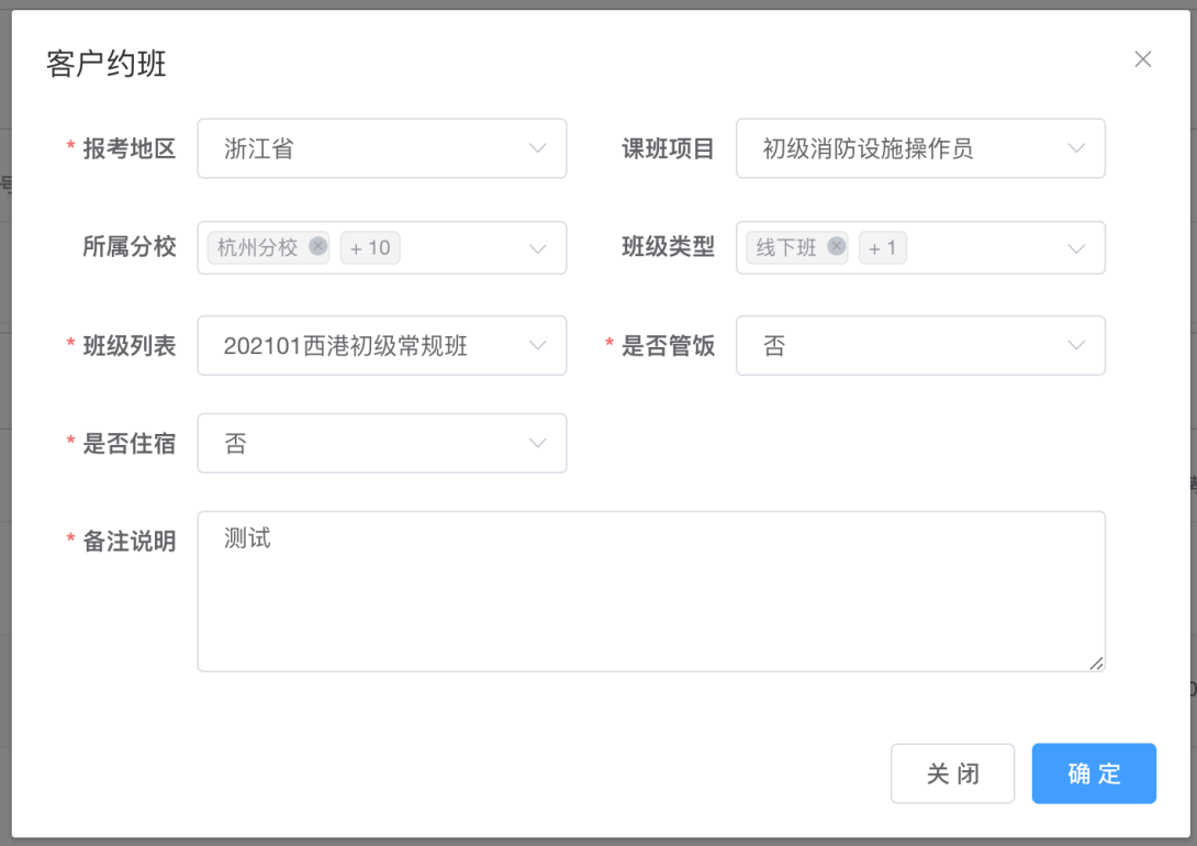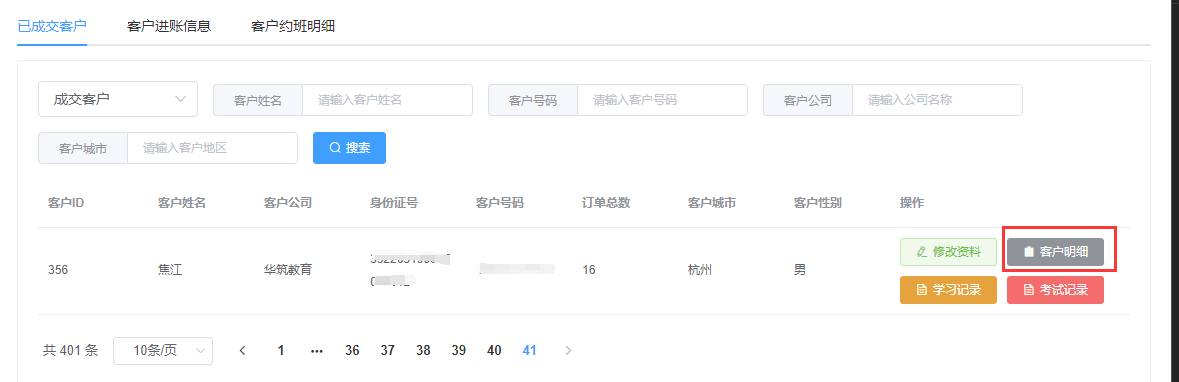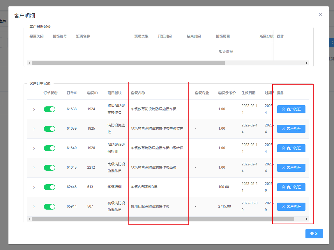 确定约班后,就能看到,这个客户,已经约到了哪个班级里,如果约错了,可以点击详情按钮,进行删除