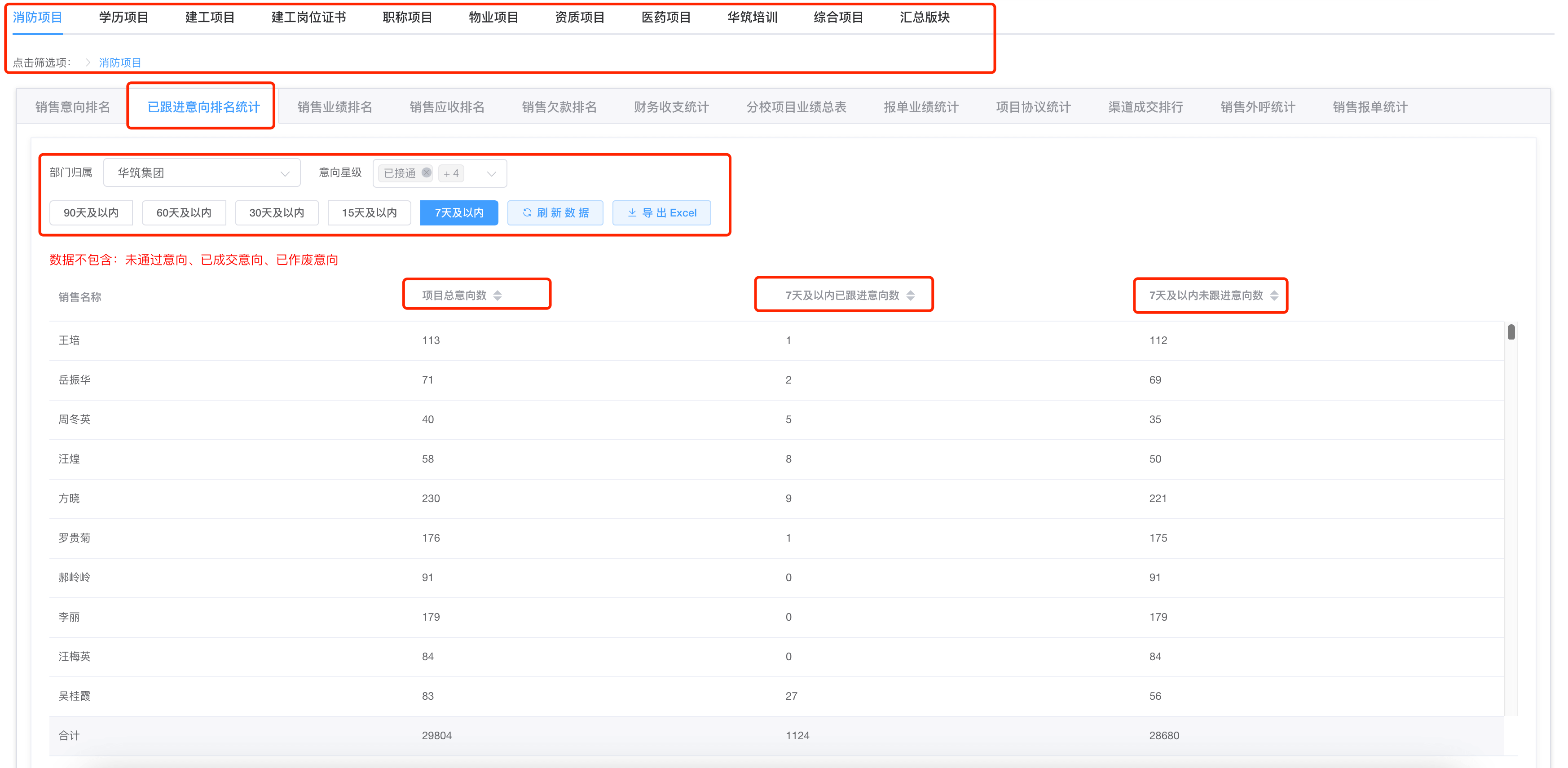 表一:销售意向排名(销售、部门意向、部门意向人均排名统计,便于关注销售、部门各种状态的意向数情况)