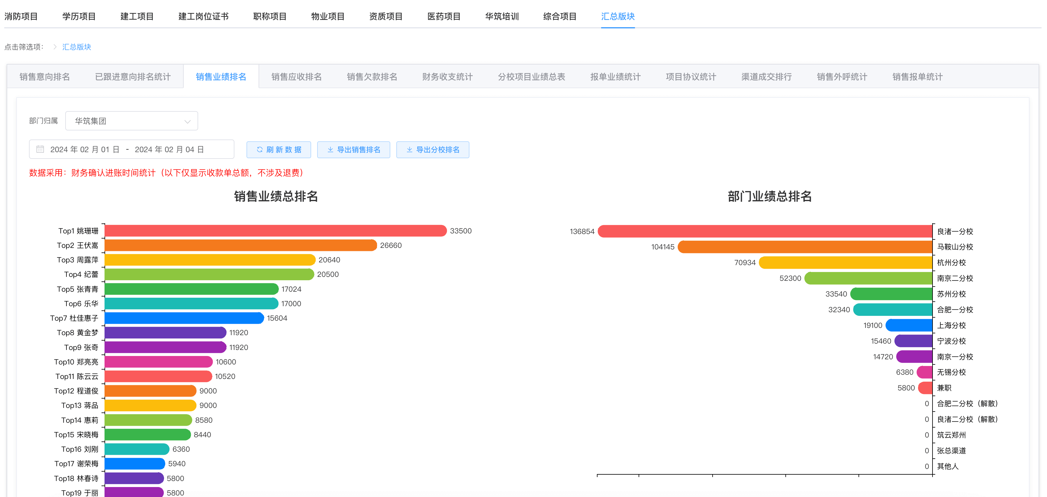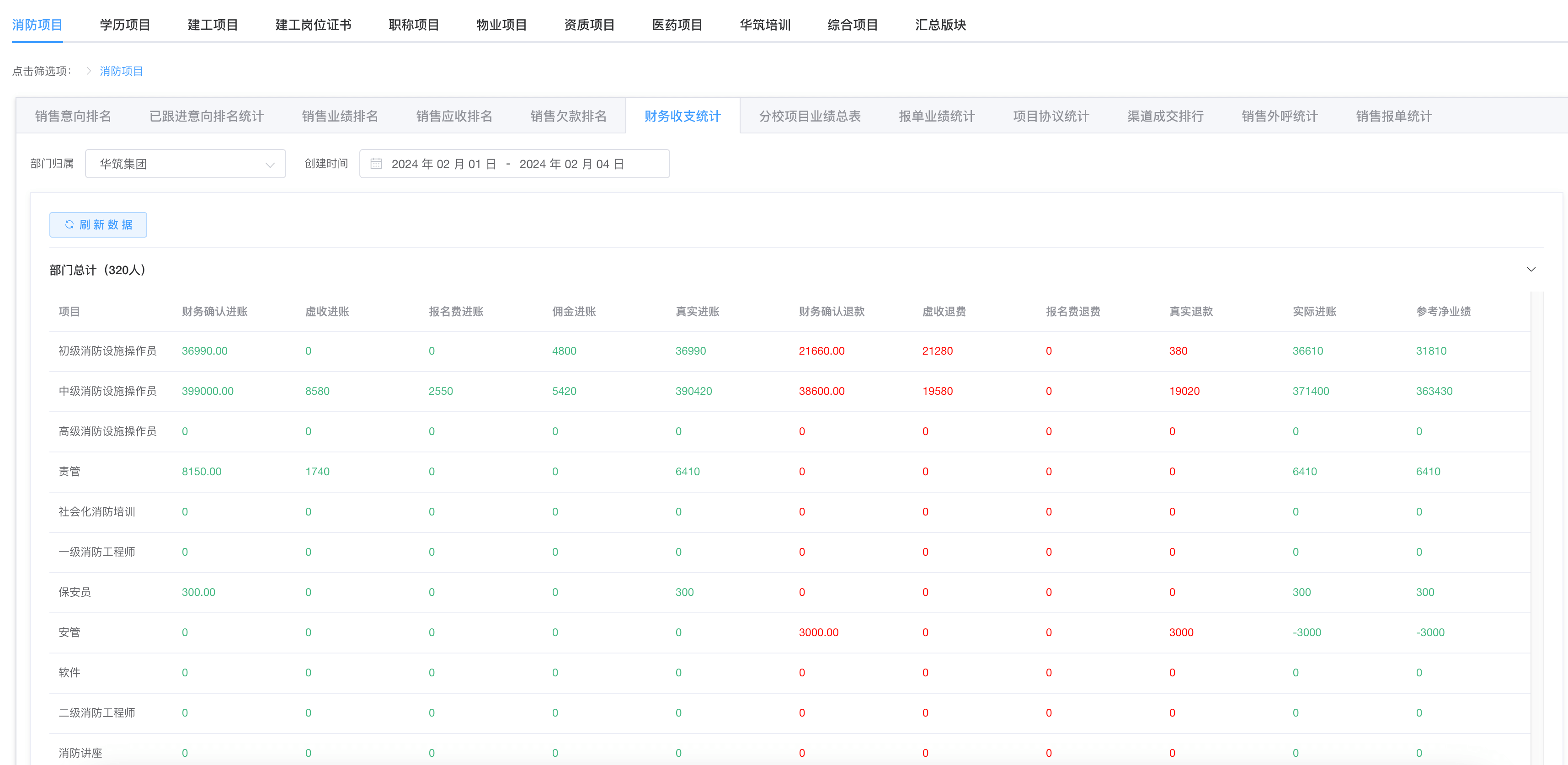 表六:财务收支统计(财务收支统计,便于关注部门各项目的财务审核进账、退费情况)