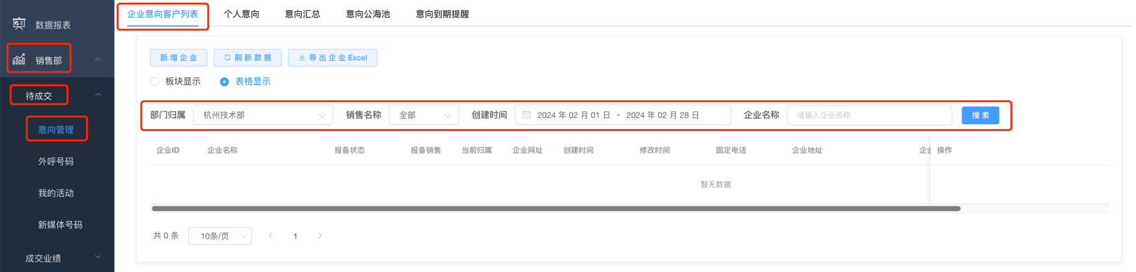 一、企业意向客户列表:可通过该表知道某时间、某销售的企业客户数量情况,也可导出Excel查看