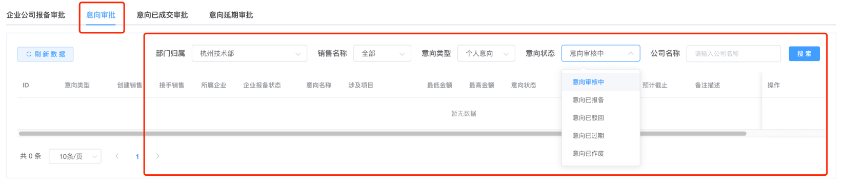 在销售管理-->意向审批-->意向审批,可处理部门伙伴提交上来的新意向,进行查看且审核