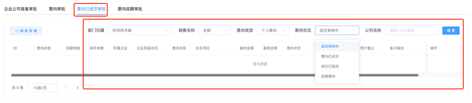 在销售管理-->意向审批-->意向审批,可处理部门伙伴提交上来已经成交的意向,进行查看且审核