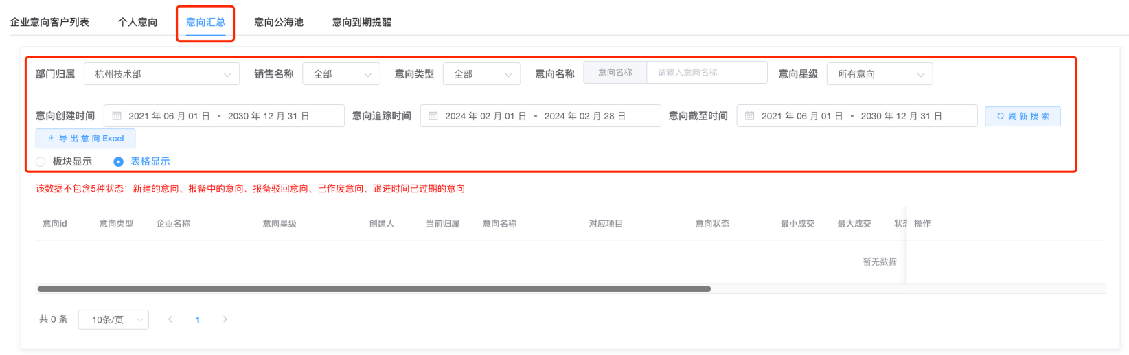 二、意向汇总:可通过该表,查询部门内成员的个人意向、企业意向情况,也可导出Excel查看