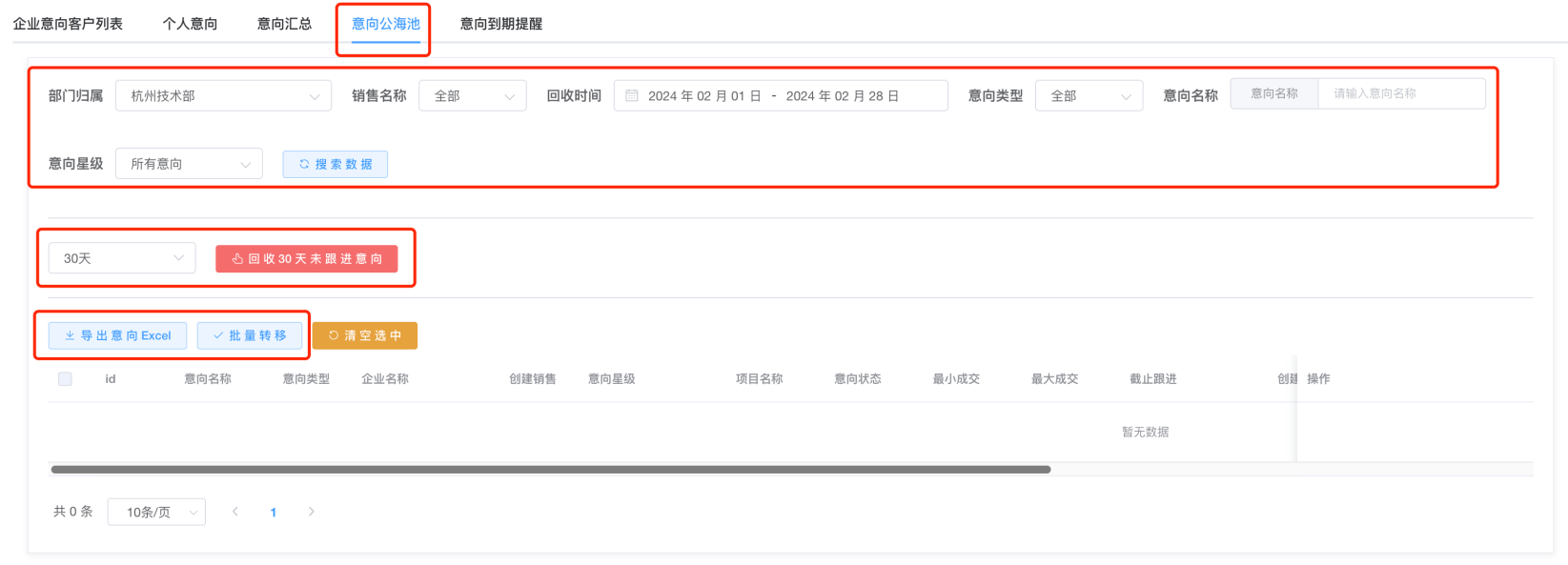 - 2、也可筛选出意向公海中的需要的意向数据后,批量转移出去;