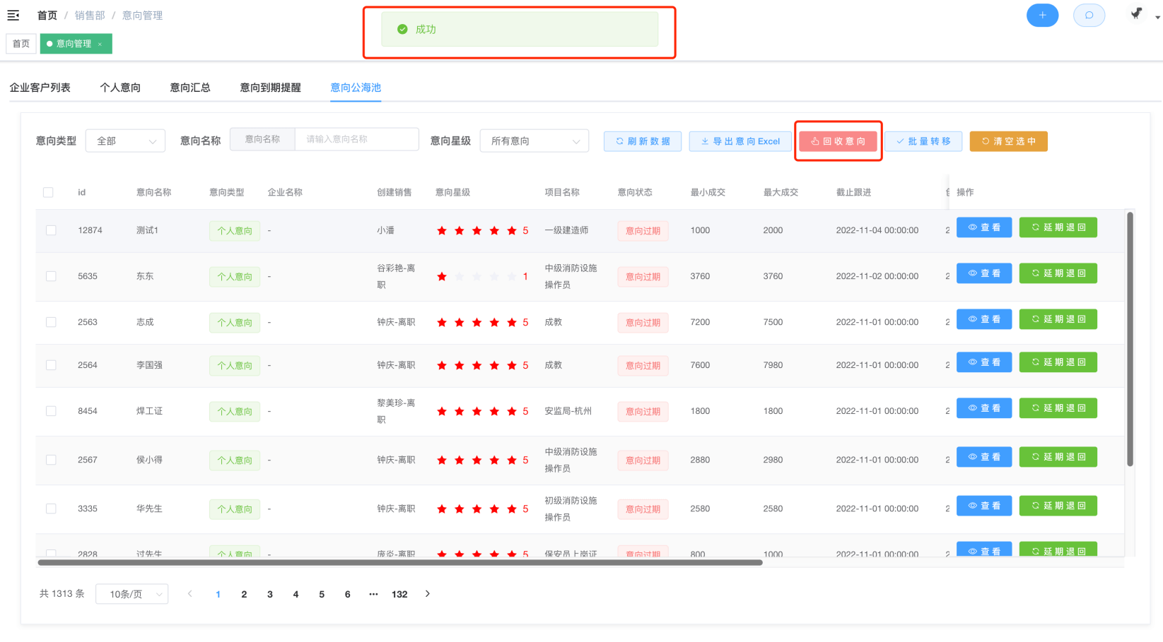 第二步:该页面中,点击回收意向,即可从本部门下的销售手上,回收截止日期已过期的意向(个人、企业)