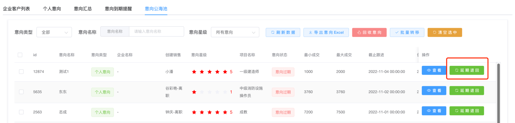 第三步:如果回收上来的意向,想重新退回给销售手上,点击延期退回按钮,即可延长1个月的截止日期,且回归销售手中,继续跟进