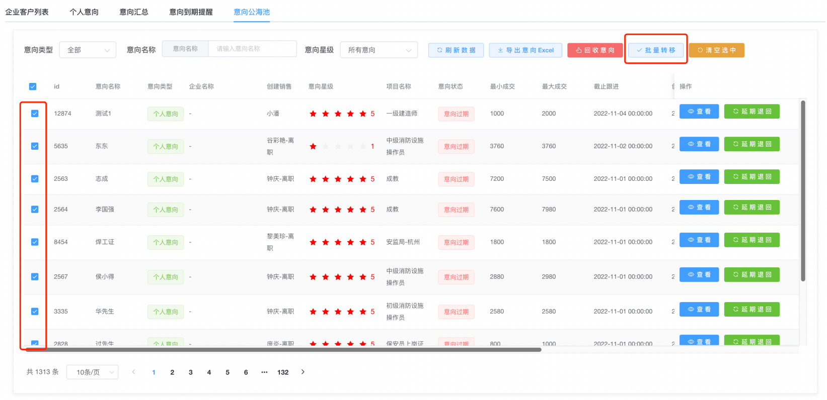 第四步:如果需要将意向,批量的转交给某个销售,需要勾选上意向,在点击批量转移按钮