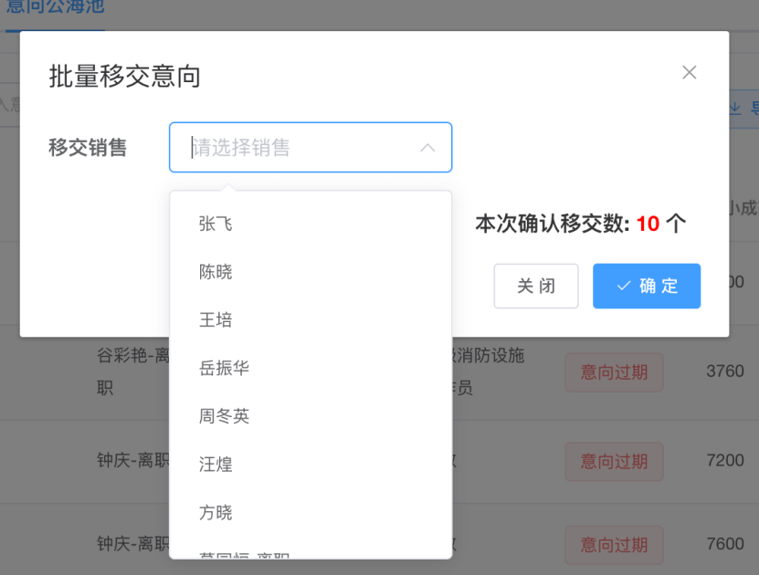 第五步:选择需要转交的销售,点击确定按钮,就成功转交意向,并延期一个月的意向截止日期