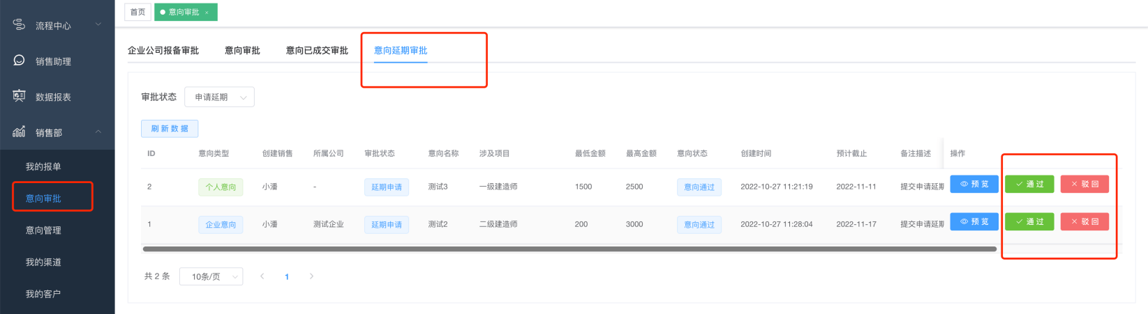 第六步:菜单栏意向审批-->意向延期审批,处理销售申请的意向延期,审核后,点击通过或者驳回,通过的意向,统一延长1个月的意向截止日期