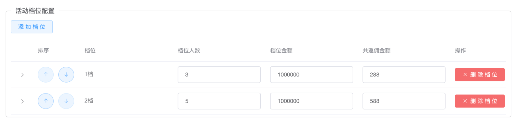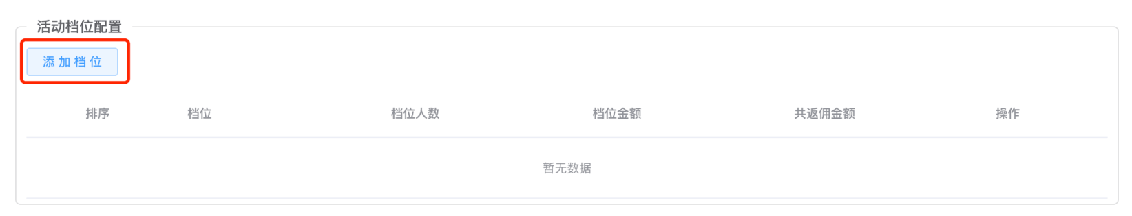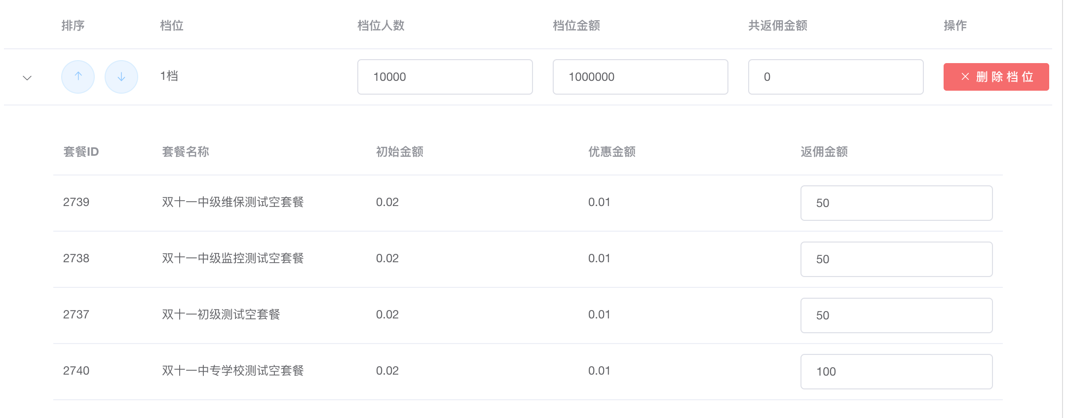 举例方案三:人数设置10000或更多(等同于不上限制),档位金额设置100万或更多(等同于不上限制),共返佣金额设置0,但是档位内的每个套餐,必须设置佣金,意义为该订单的单个返佣金额,可以不一致,也可配置一致金额