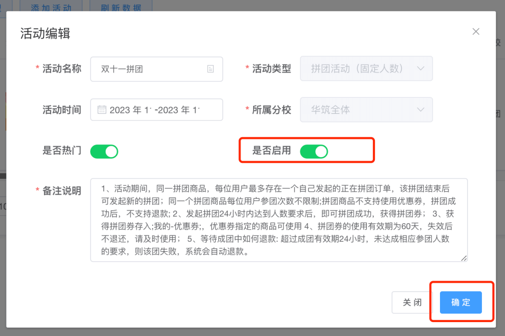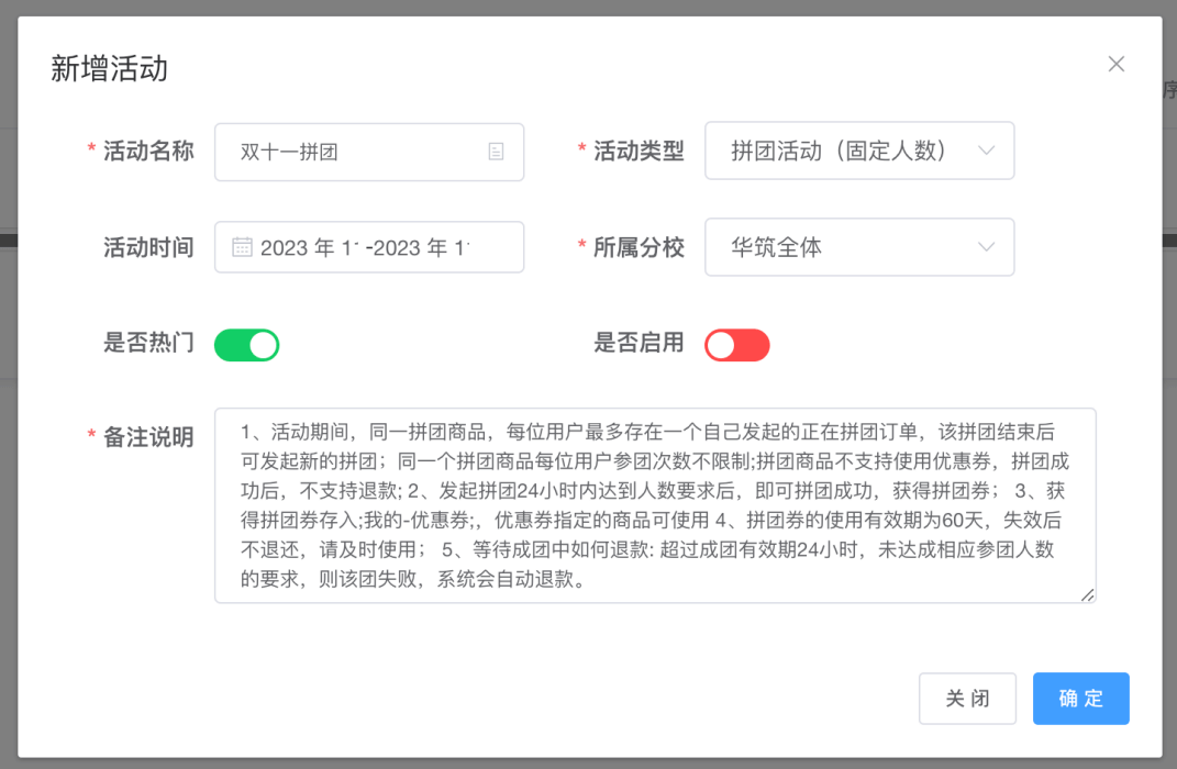 - (7)备注说明:仅提供参与活动的普通客户阅读,若针对团长的活动规则,不要写在备注说明上