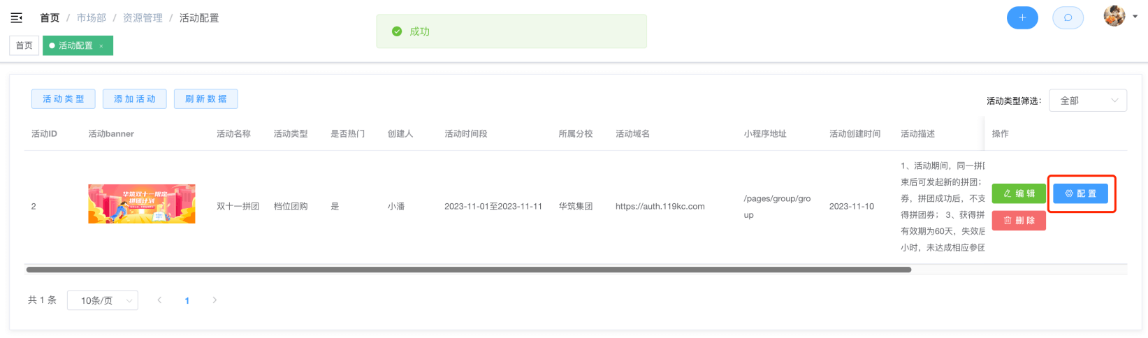 第三步:活动创建成功后,点击配置按钮