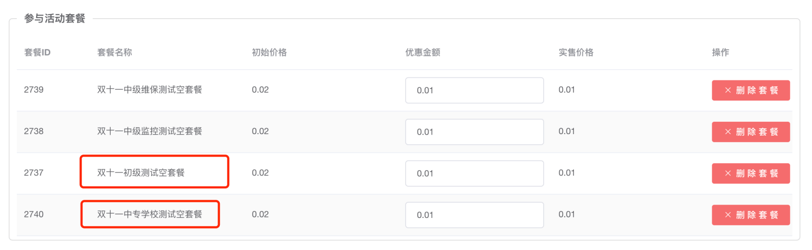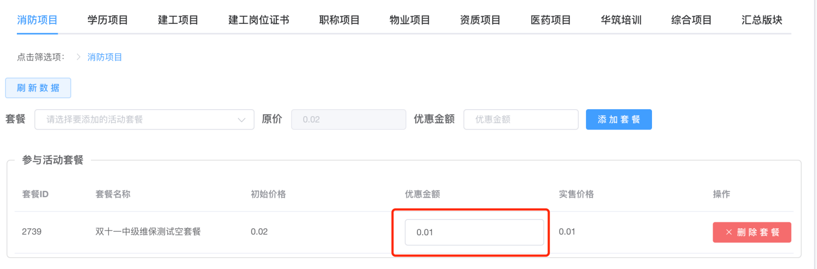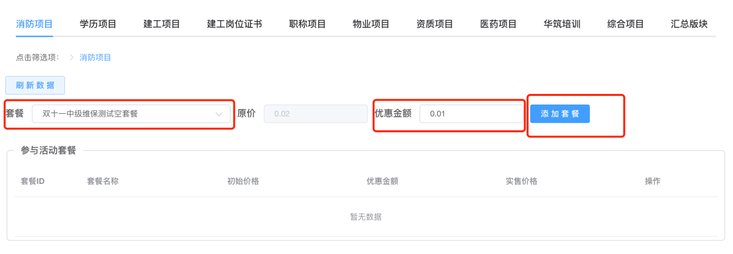 选择套餐,填写优惠金额,并添加套餐